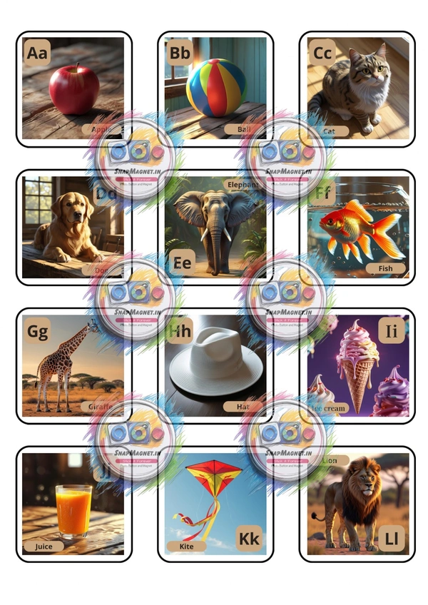 A complete set of 26 colorful, durable fridge magnets in 50 mm Square Shape of A–Z letters—Both small letters and Capital letter along with an item picture starts with that alphabet, perfect for homes, classrooms, offices, and playrooms.